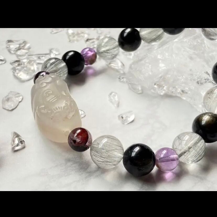 石の素材…ゴールデンオブシディアン、ガーデンアメジスト、ブラックルチルクォーツ、ゴビ瑪瑙(貔貅)