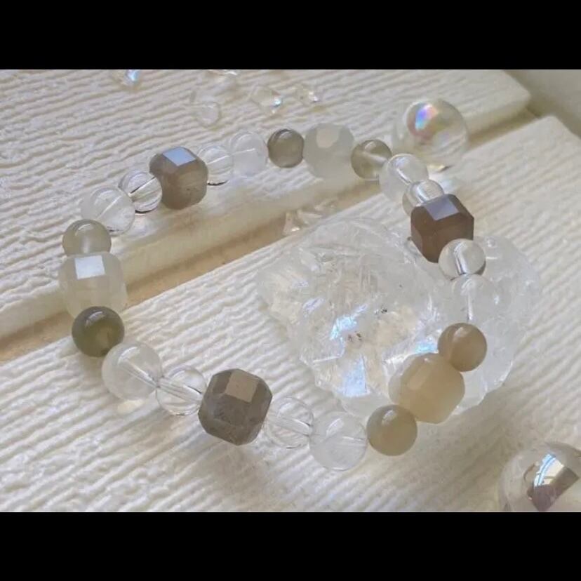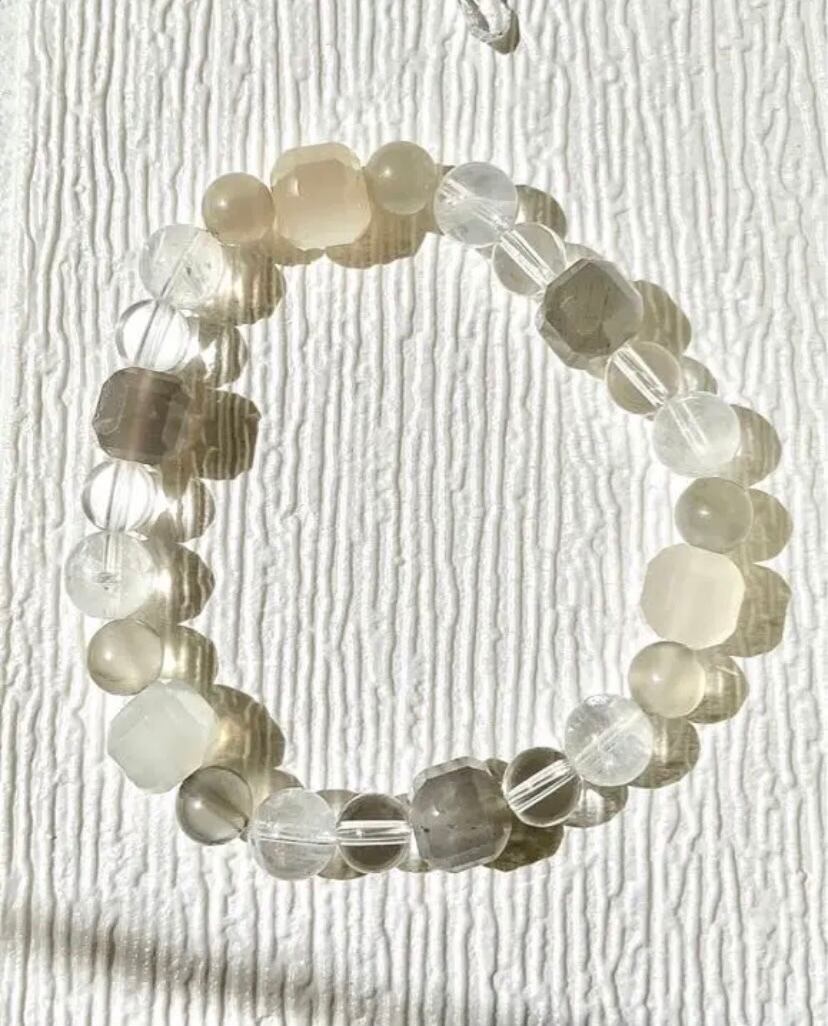 かわいい形のグレームーンストーンに内包物ふわふわ!なエンジェルラダークォーツを合わせて、美しくて儚げなブレスレットに仕上げました。