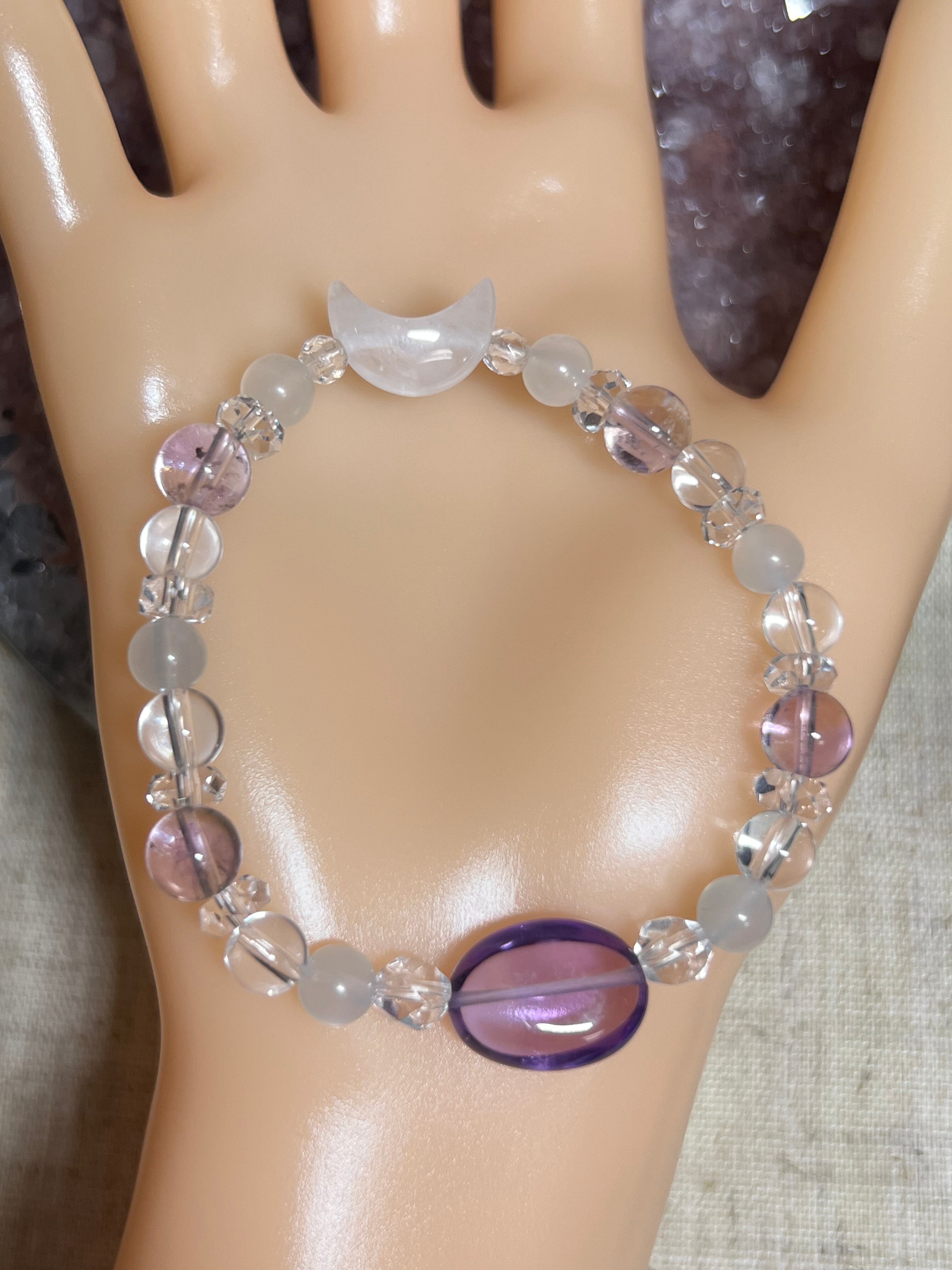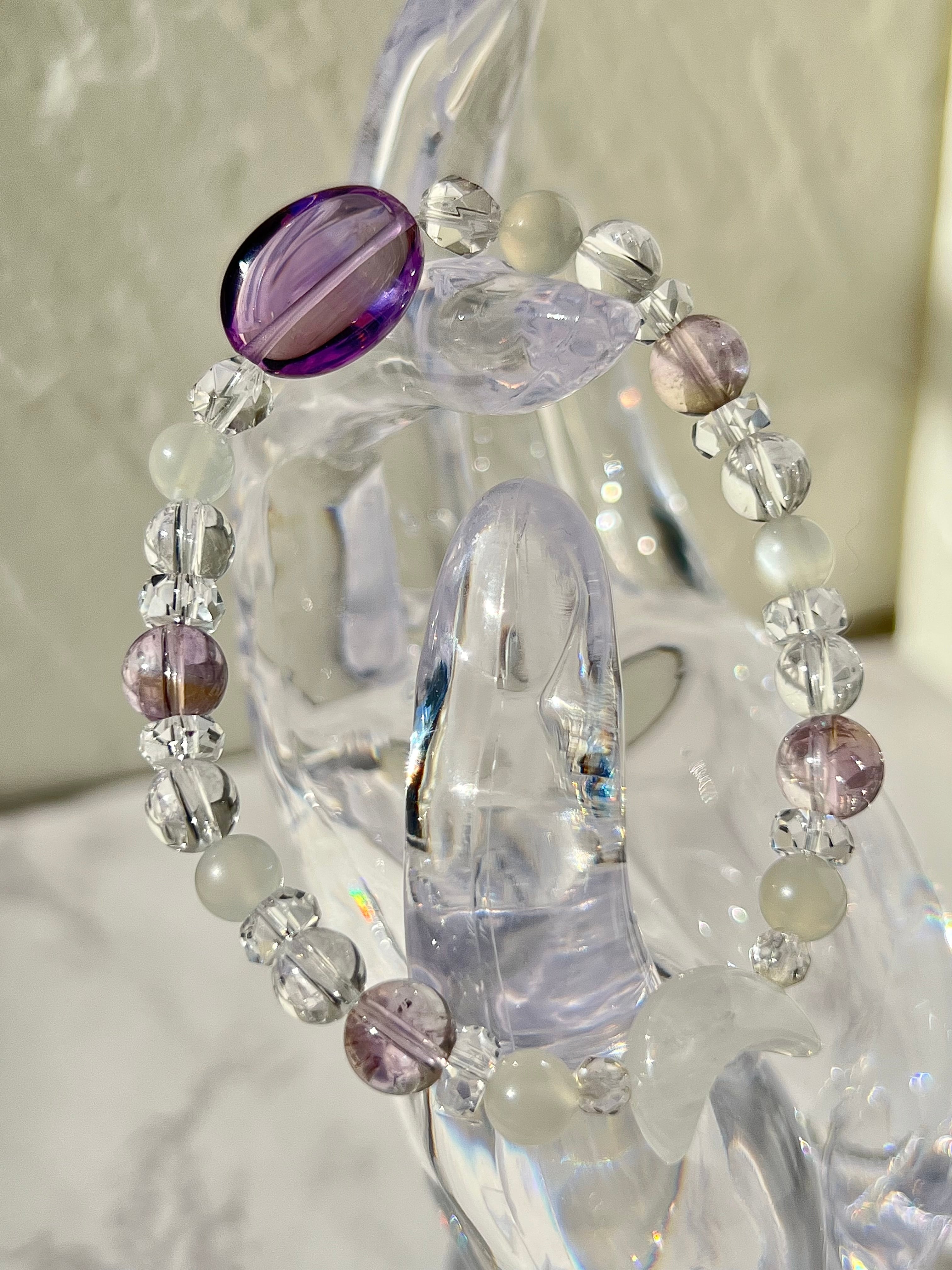 高品質なアメジストタンブルと、月の形をした水晶を合わせて神秘的な雰囲気に仕上げました。