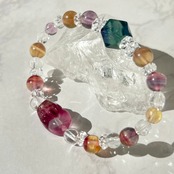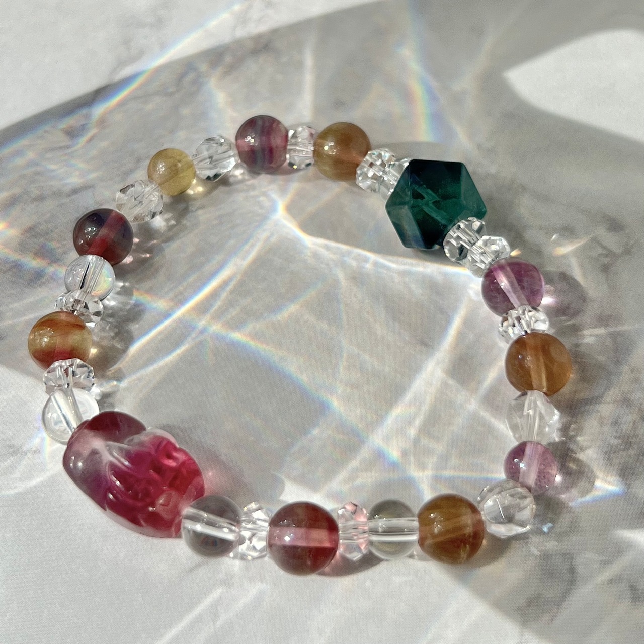 使用した天然石…フローライト(ラウンド、貔貅、多面体)、水晶(ラウンド、ロンデル、カット)