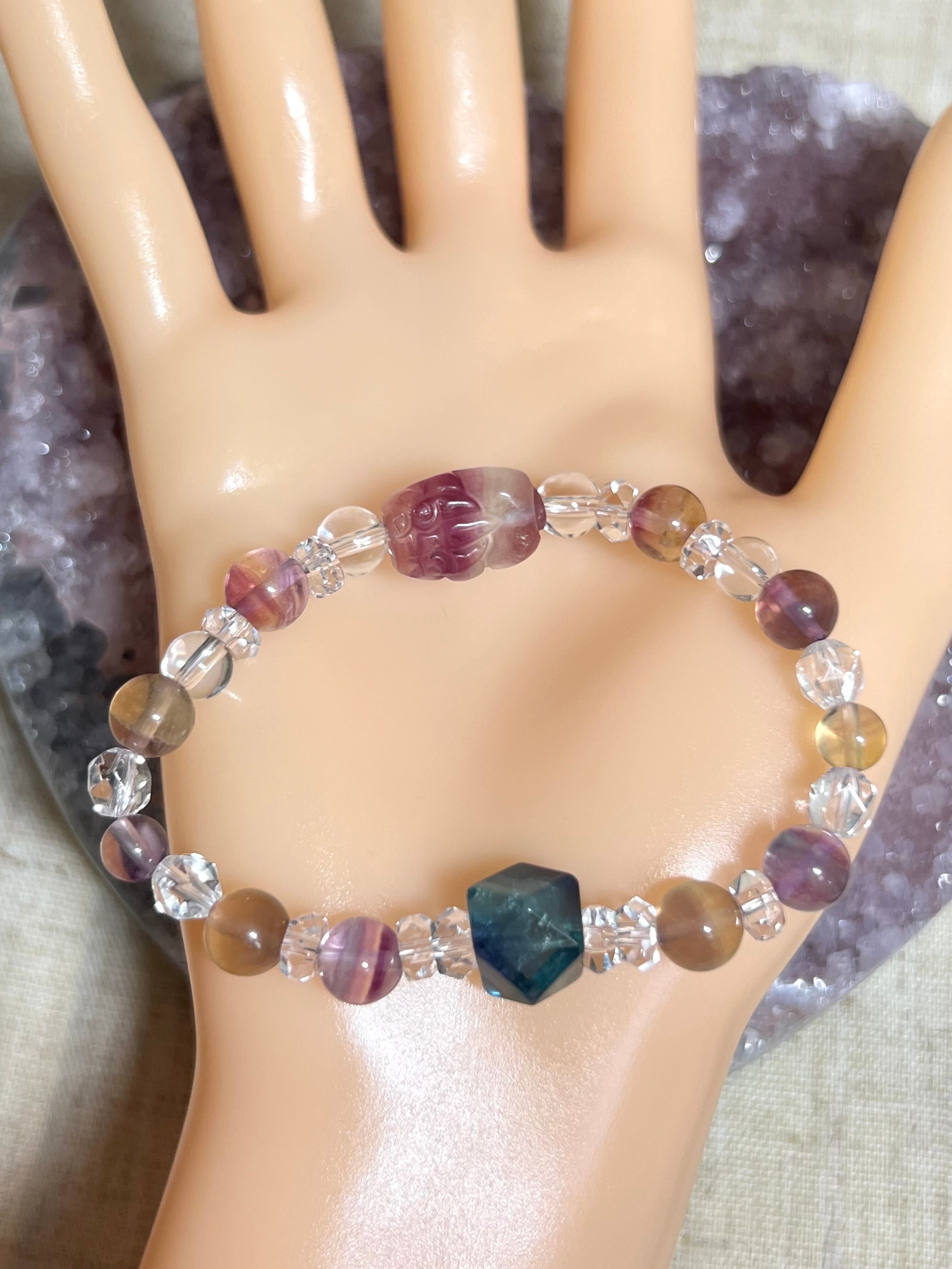 キラキラなフローライトと可愛い貔貅ちゃんで仕上げた、見てるだけで元気が貰えるようなブレスレットです。多面体のフローライトもキラキラですよ〜♪