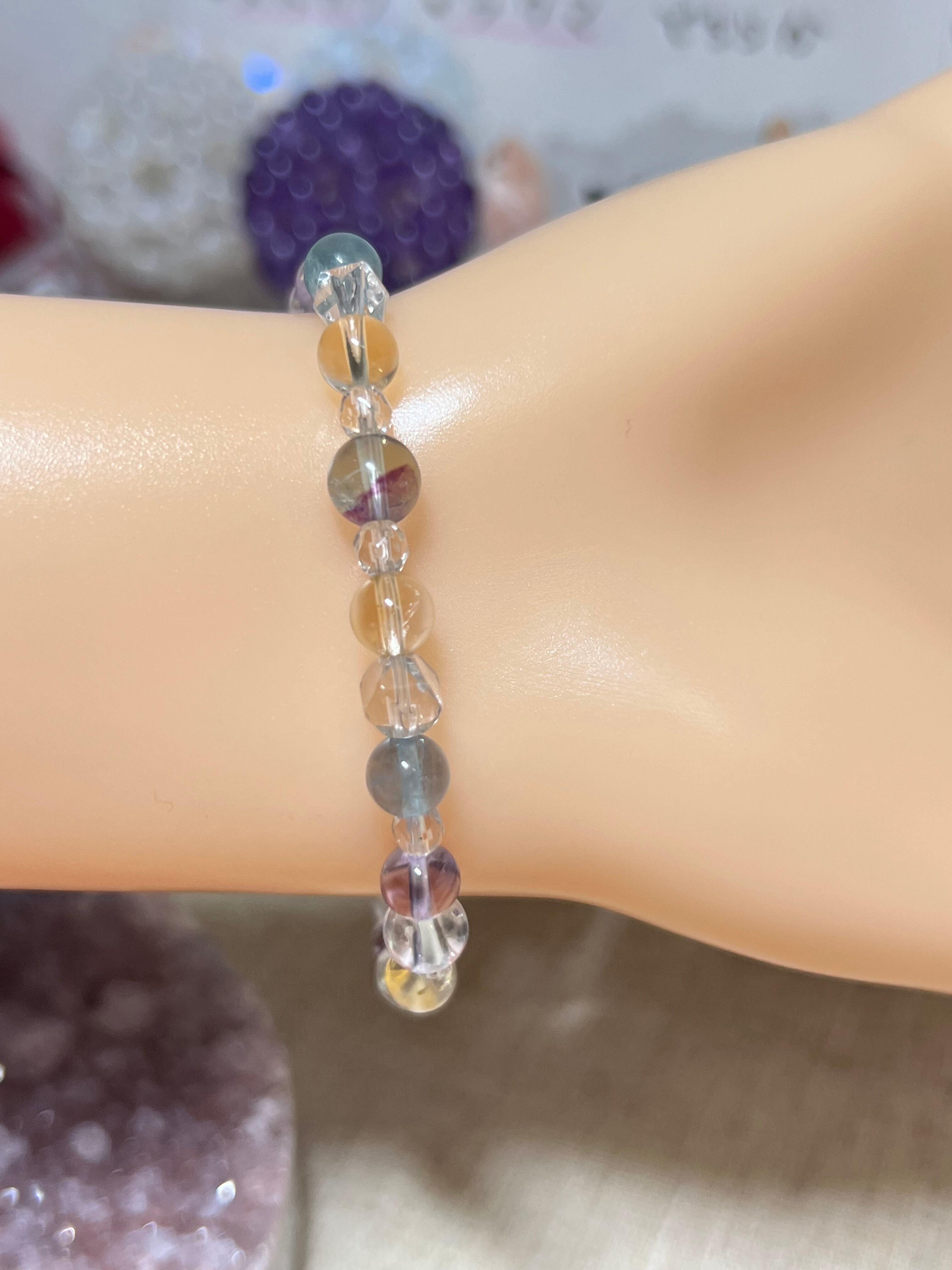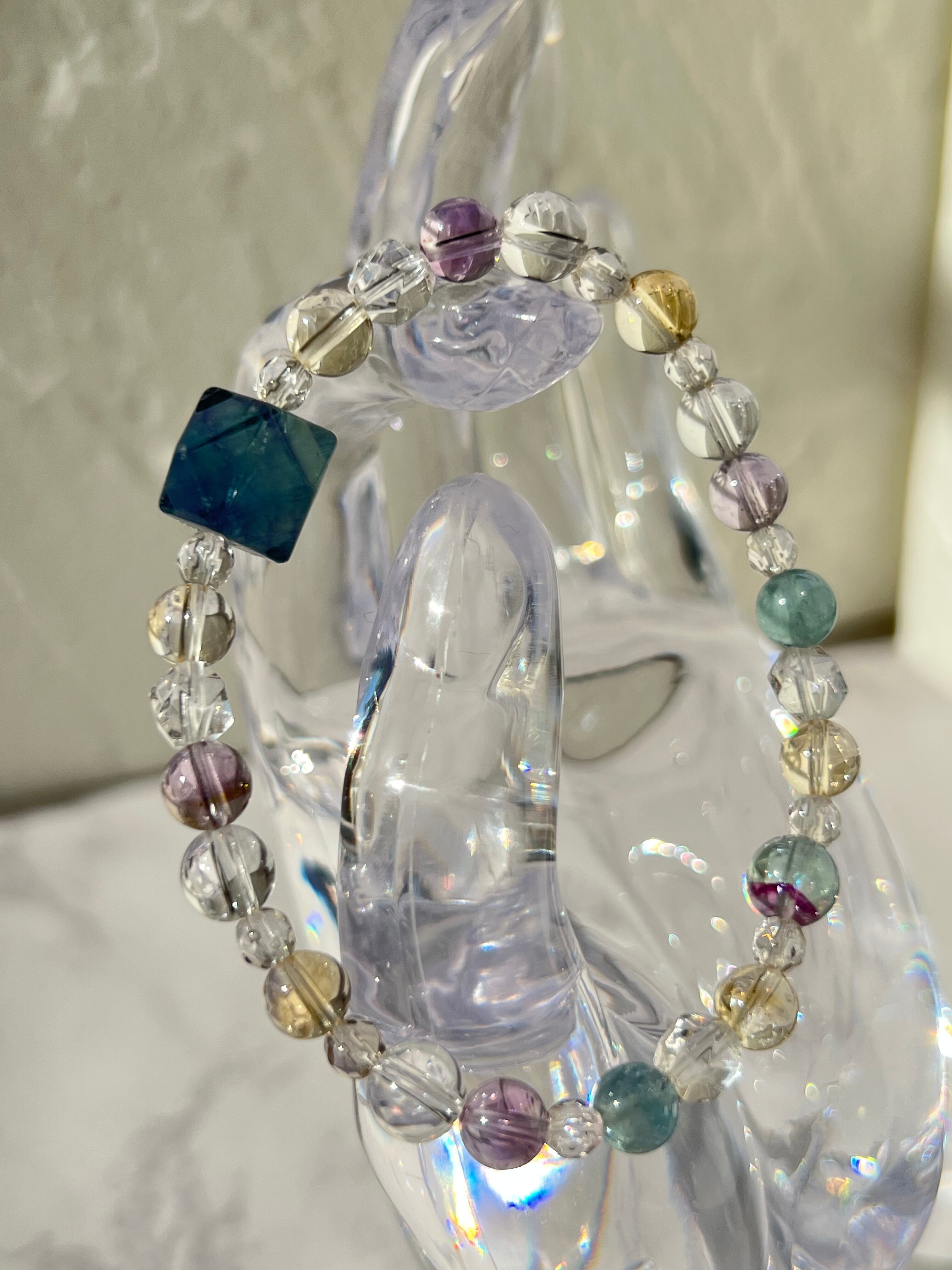 フローライトとクリアなマルチクォーツで組んだ透明感のあるブレスレットです。カラフルだけど肌なじみがいいので、子供っぽさも少なくデイリー使いがしやすいです!