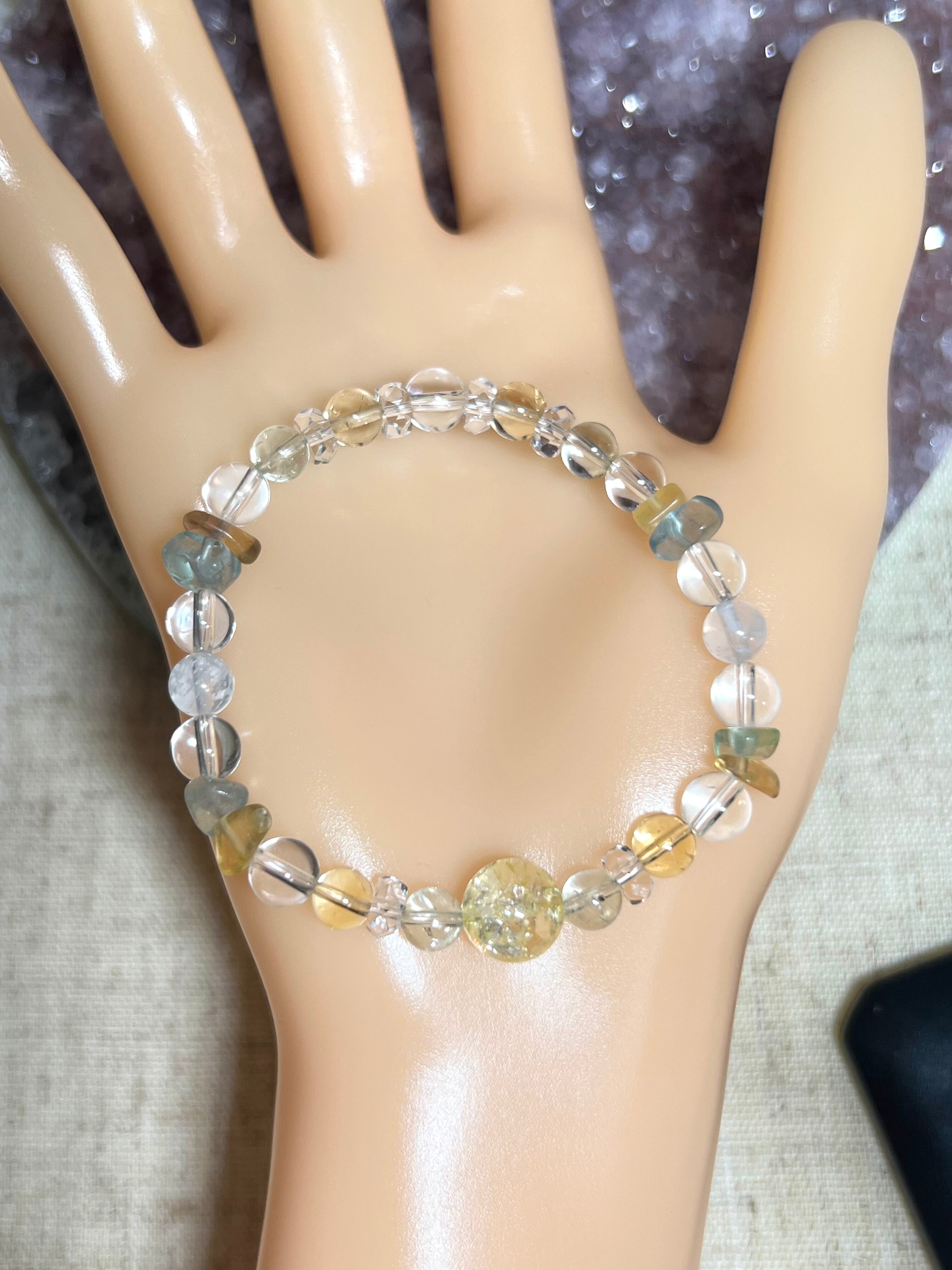 使用した天然石…フローライトさざれ、クラックレモンクォーツ、クリアシトリン、クリアグリーンアメジスト、セリサイトインクォーツ、水晶(ラウンド、ロンデル)