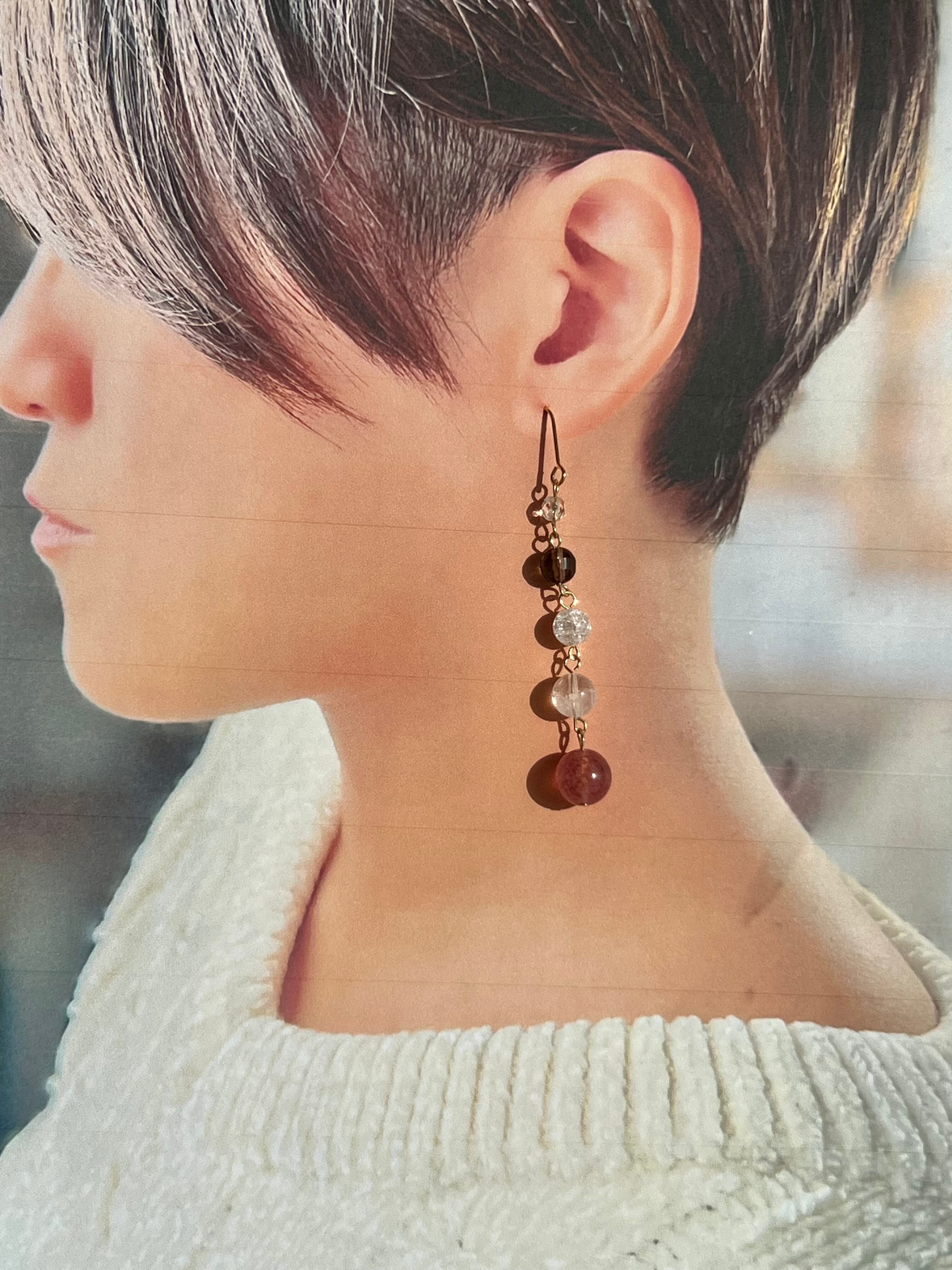 キラキラなストロベリークォーツをポイントに、スノードームのようなセリサイトインクォーツとスモーキークォーツで大人っぽくも幻想的な雰囲気のピアスに仕上げました。
