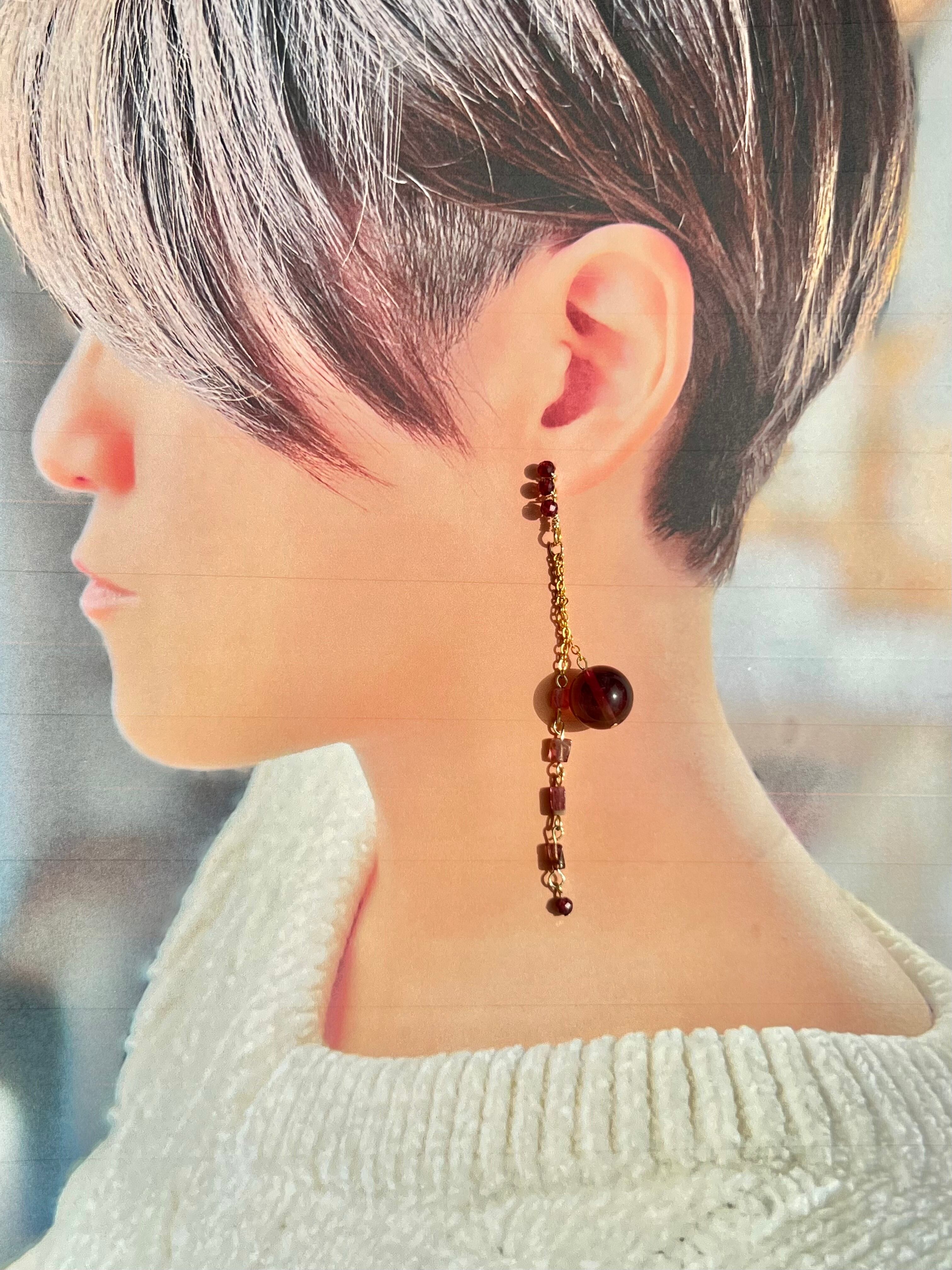 耳元の素材はサージカルステンレス、樹脂ポスト、イヤリングからお選びいただけます。カラーは基本的に使用しているワイヤーやチェーンのカラーに合わせております。