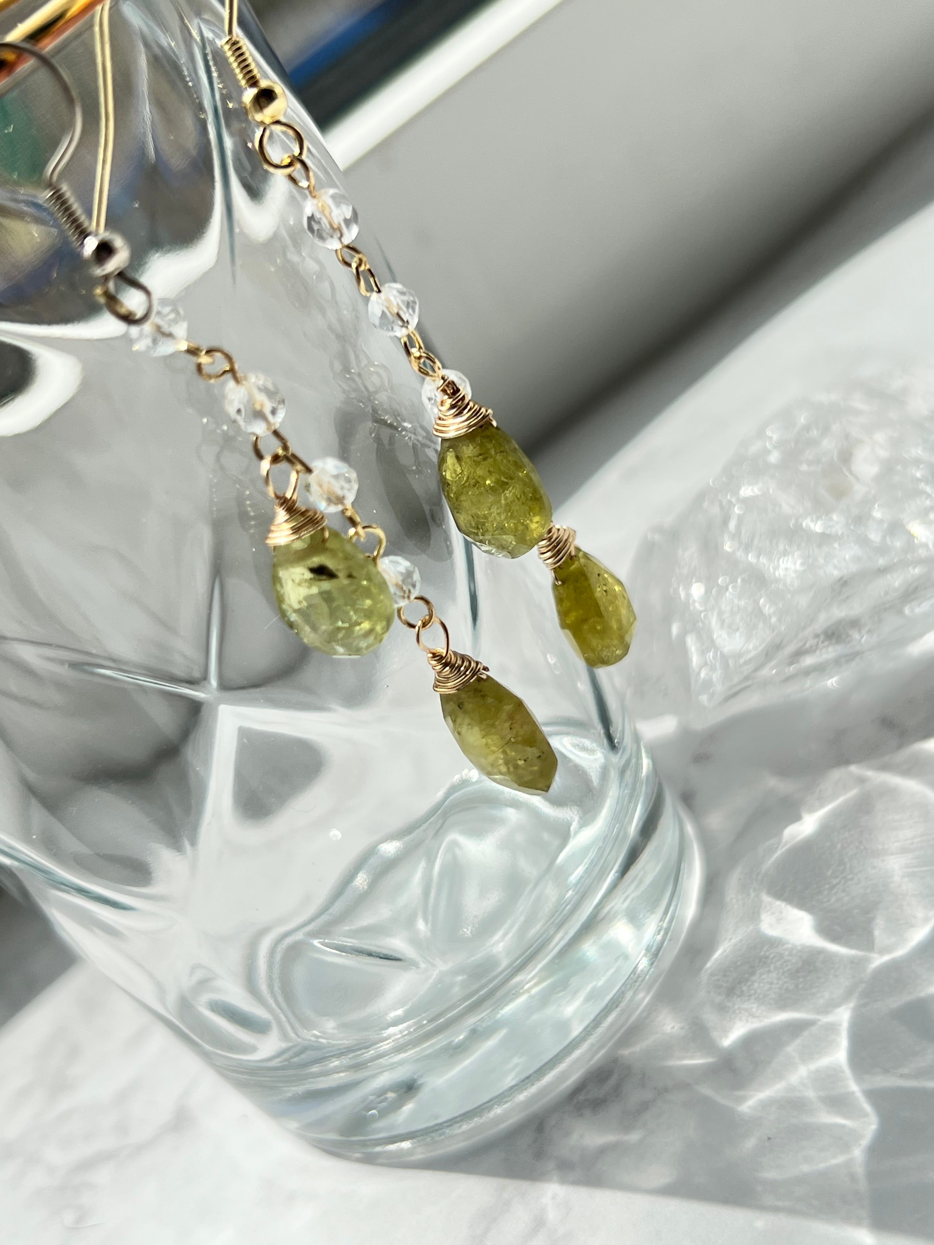 キラキラな大粒グリーンアメジストを贅沢に使用して、カット水晶を合わせました!内包物がまた個性的ですね♪
