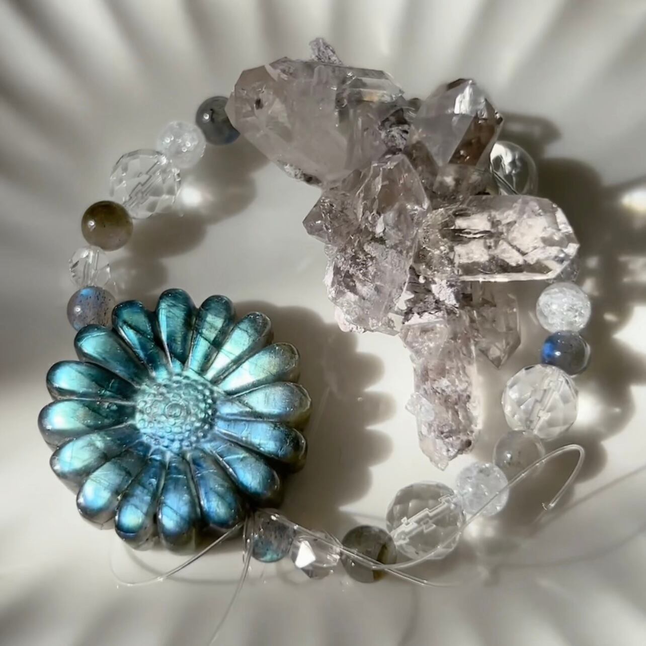 使用した天然石…水晶(クラック、ロンデル、カット)アイリスクォーツ、ラブラドライト