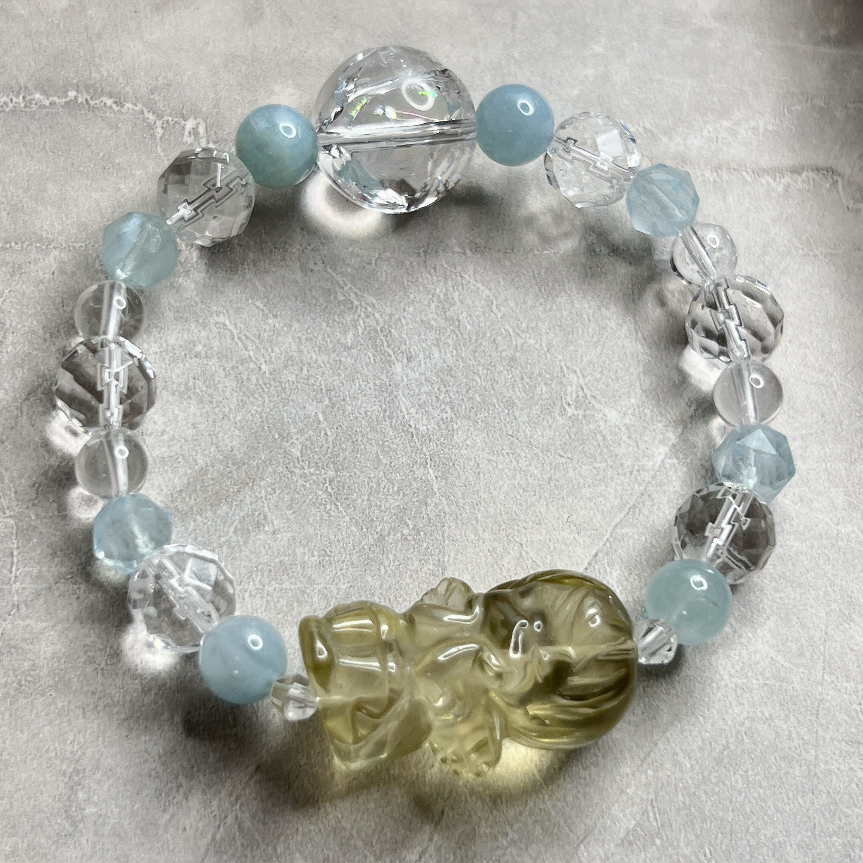 使用した天然石…シトリン(天使モチーフ)、アイリスクォーツ、水晶(カット、ミラーボールカット)、ヒマラヤ水晶、アクアマリン(カット、ラウンド)